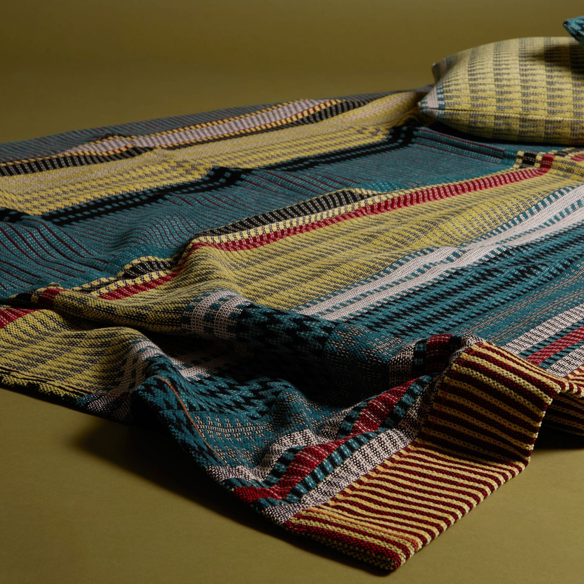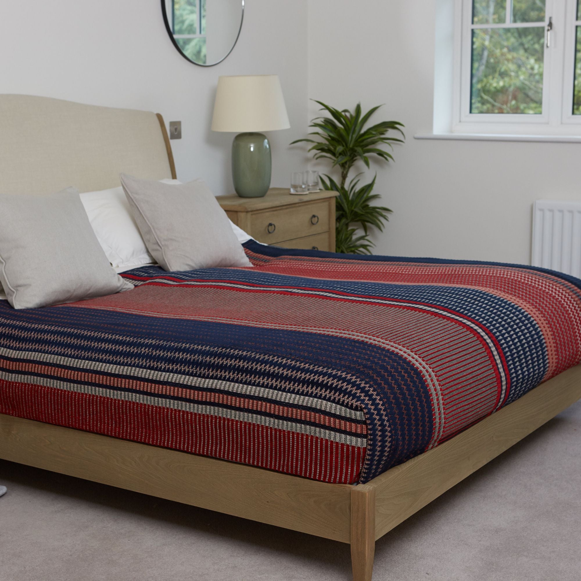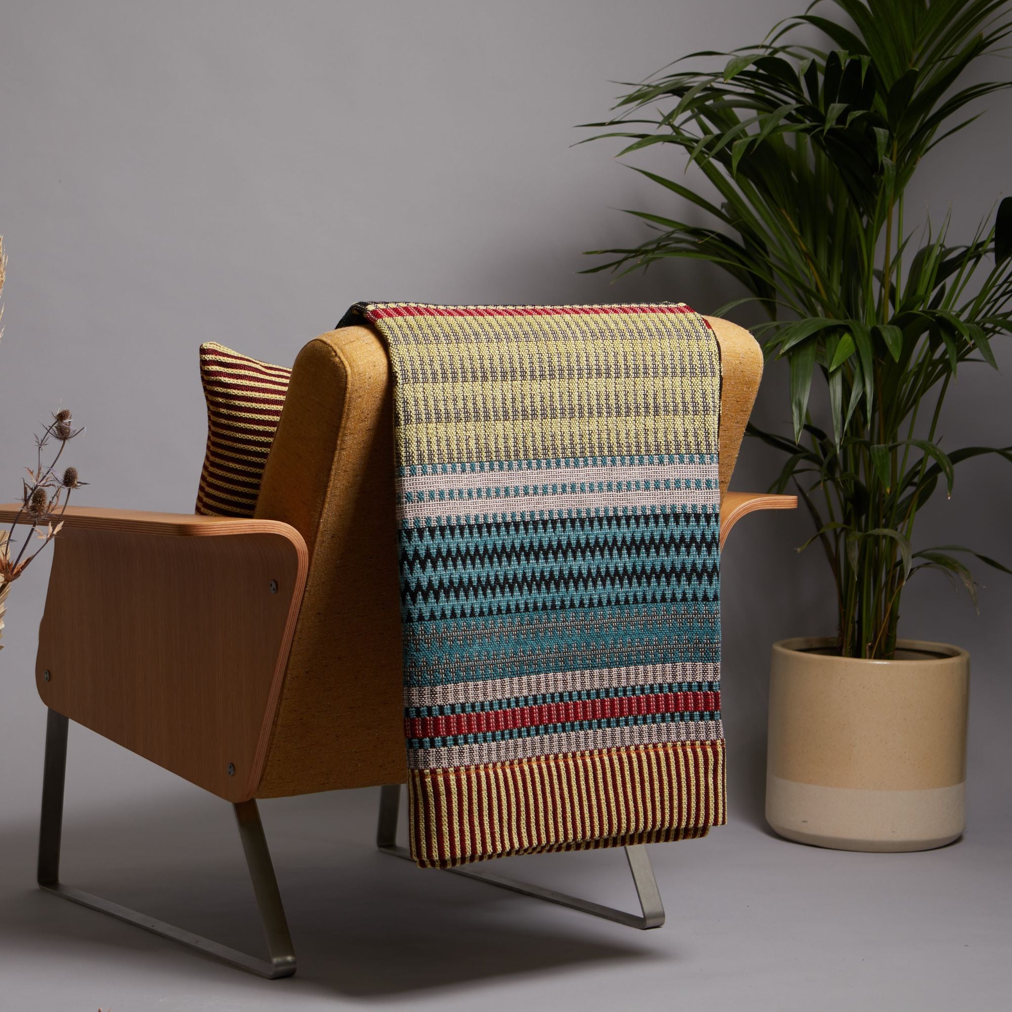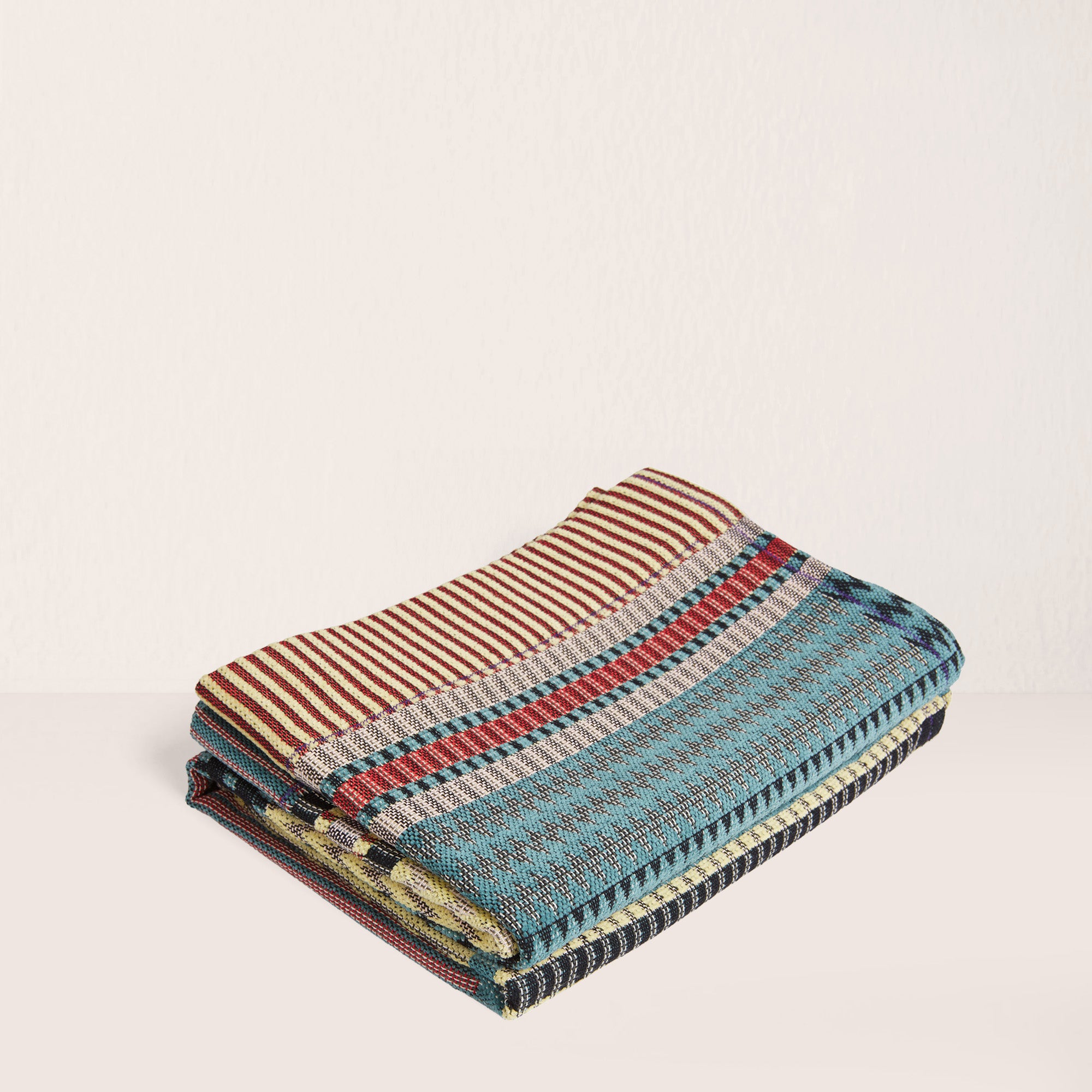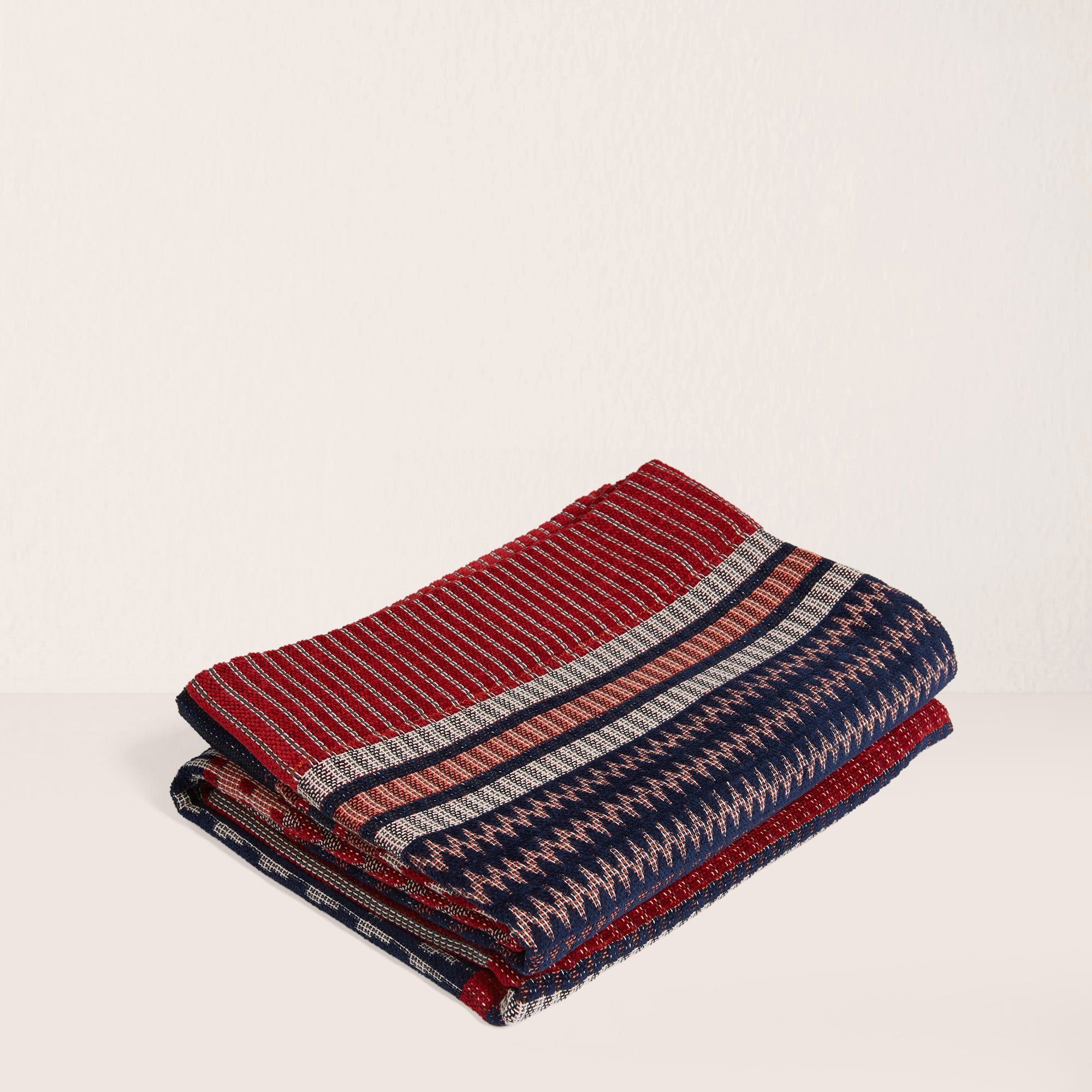Le plaid Ettore – Petit combine une chenille luxueuse avec des accents de coton vif pour créer un jeu riche et accrocheur de bleu Oxford profond, de rouge vif, d'argile terreuse et de blanc doux. Ses zigzags alternés et ses motifs géométriques apportent de la profondeur et du mouvement au design, ce qui en fait un élément remarquable dans n'importe quelle pièce.