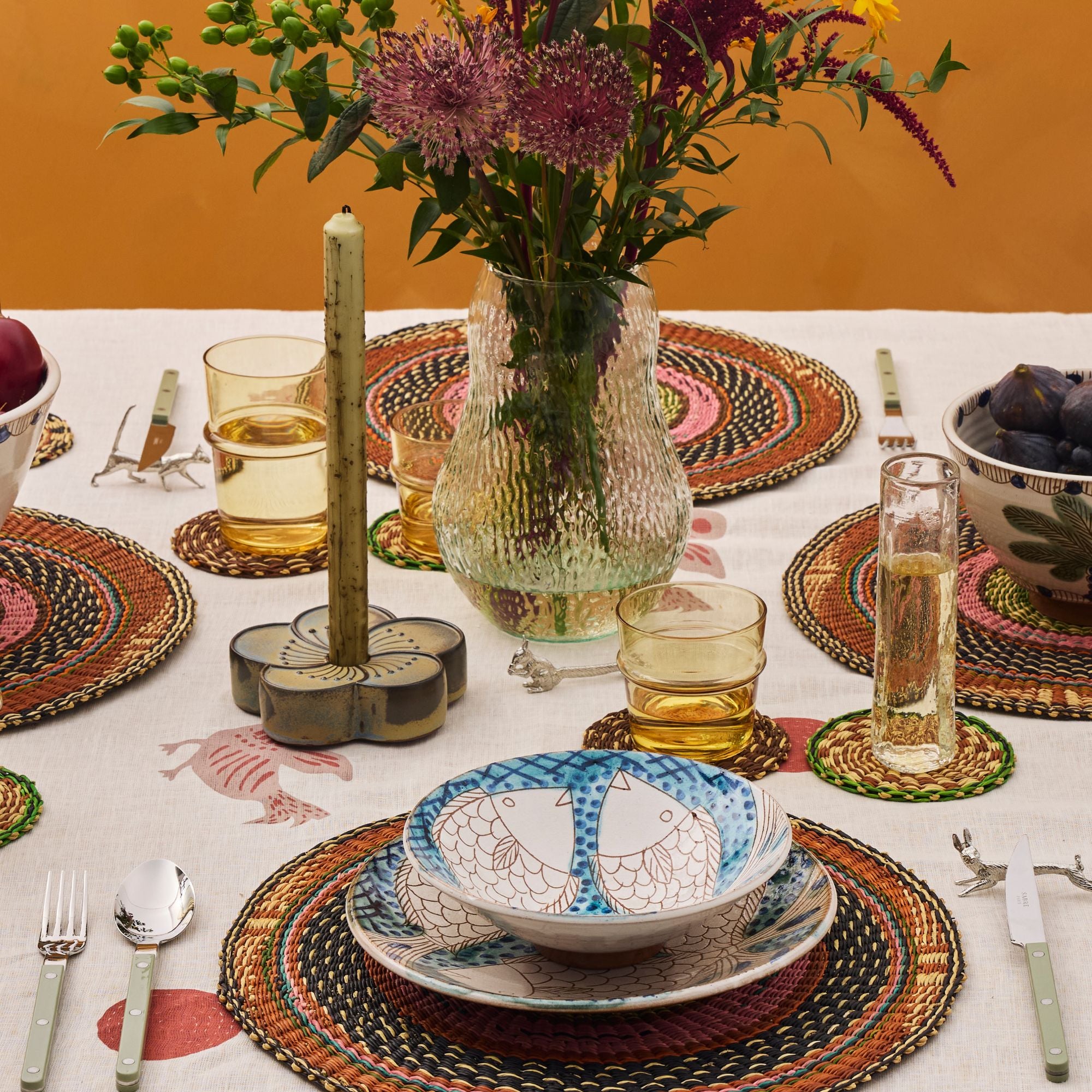 Whether holding a summer salad, various scoops of sorbet, or simply catching the light on a shelf, the Tilapia Bowl brings a splash of joy to any setting. Handcrafted in Fayoum and painted with playful fish on a dotted aqua background, it’s a charming piece made for sunny tables and easygoing days.