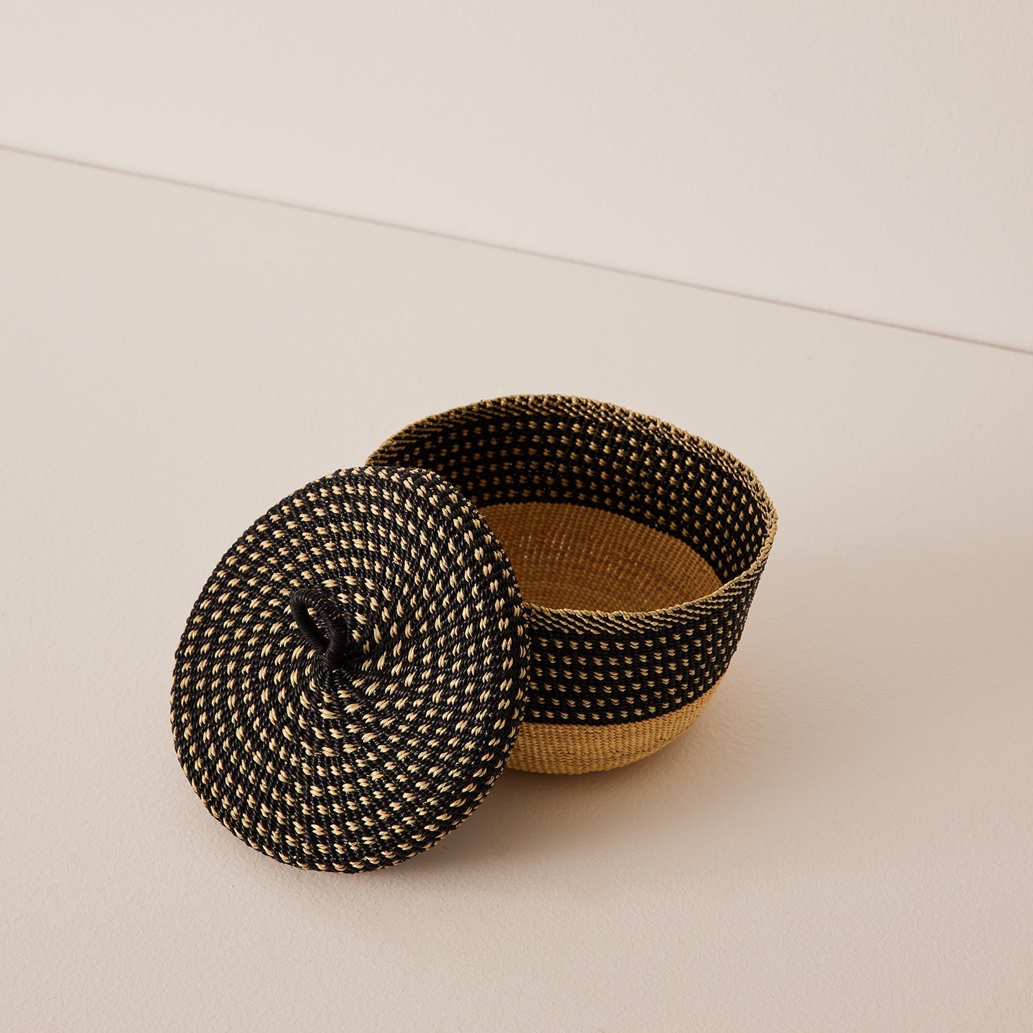 On a mission to organize your shelves? Both practical and decorative, the small Banasco basket with lid is ideal for storing jewelry and other everyday essentials. Expertly handwoven by "D-4" Akologo, one of Baba Tree's finest hat weavers in the Ghanaian town of Bolgatanga, it is crafted using a time-honored weaving technique with elephant grass.