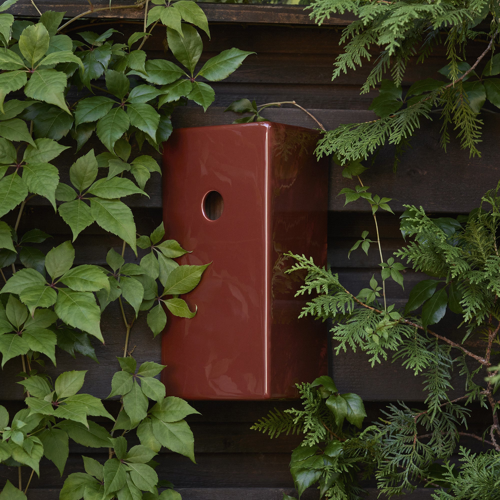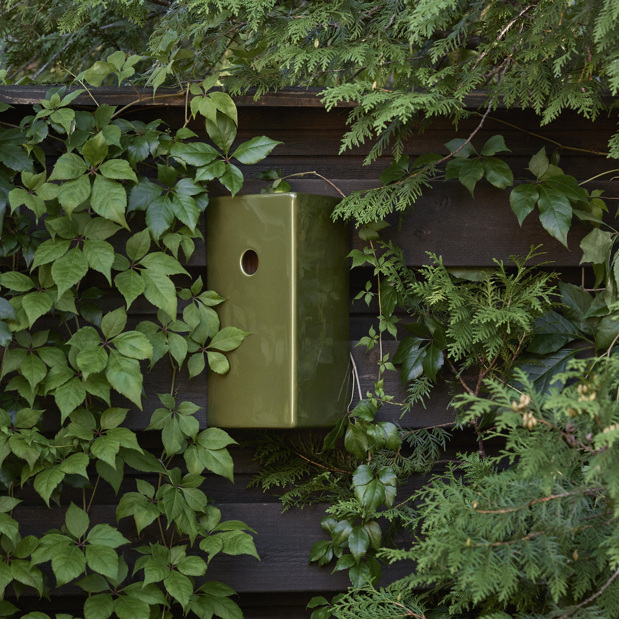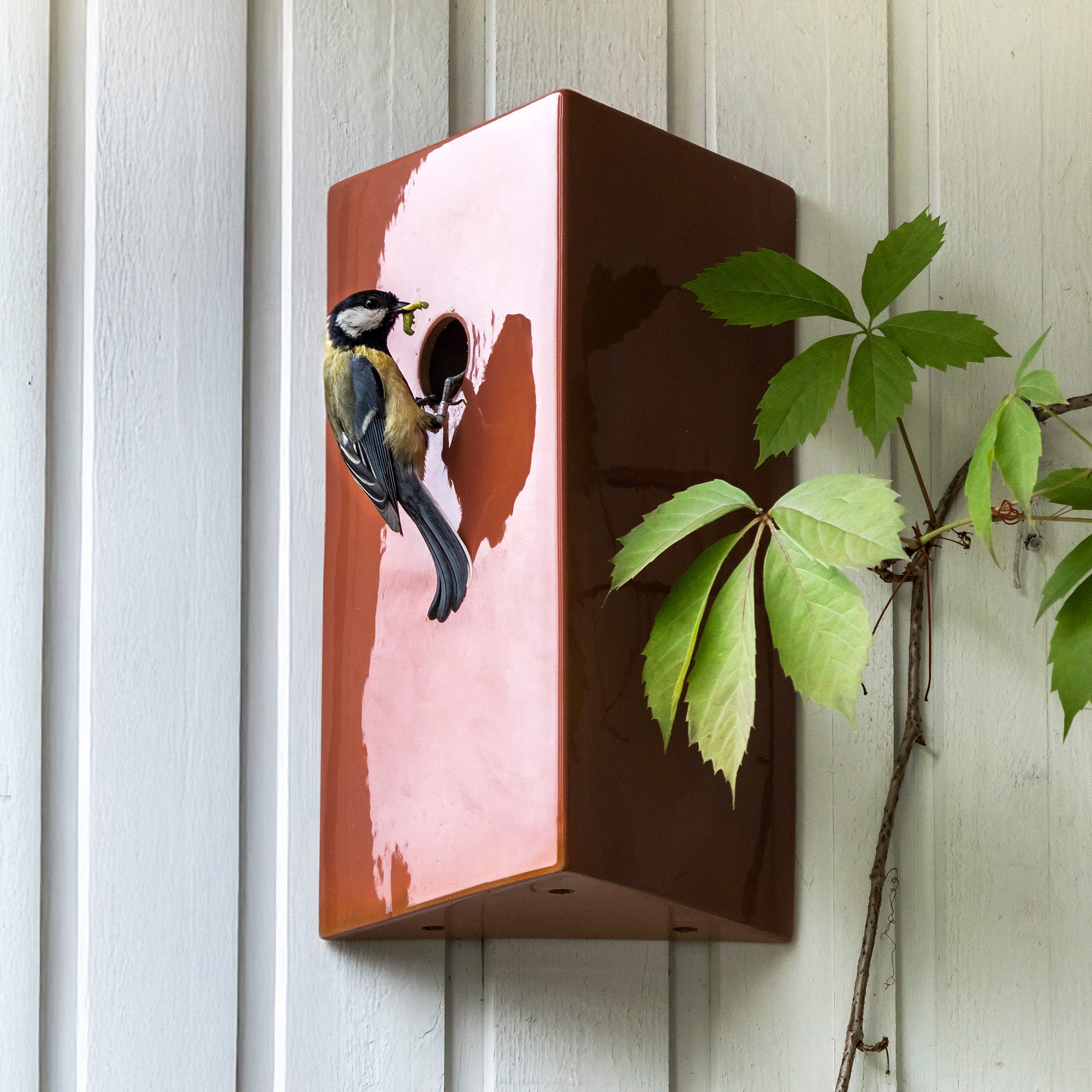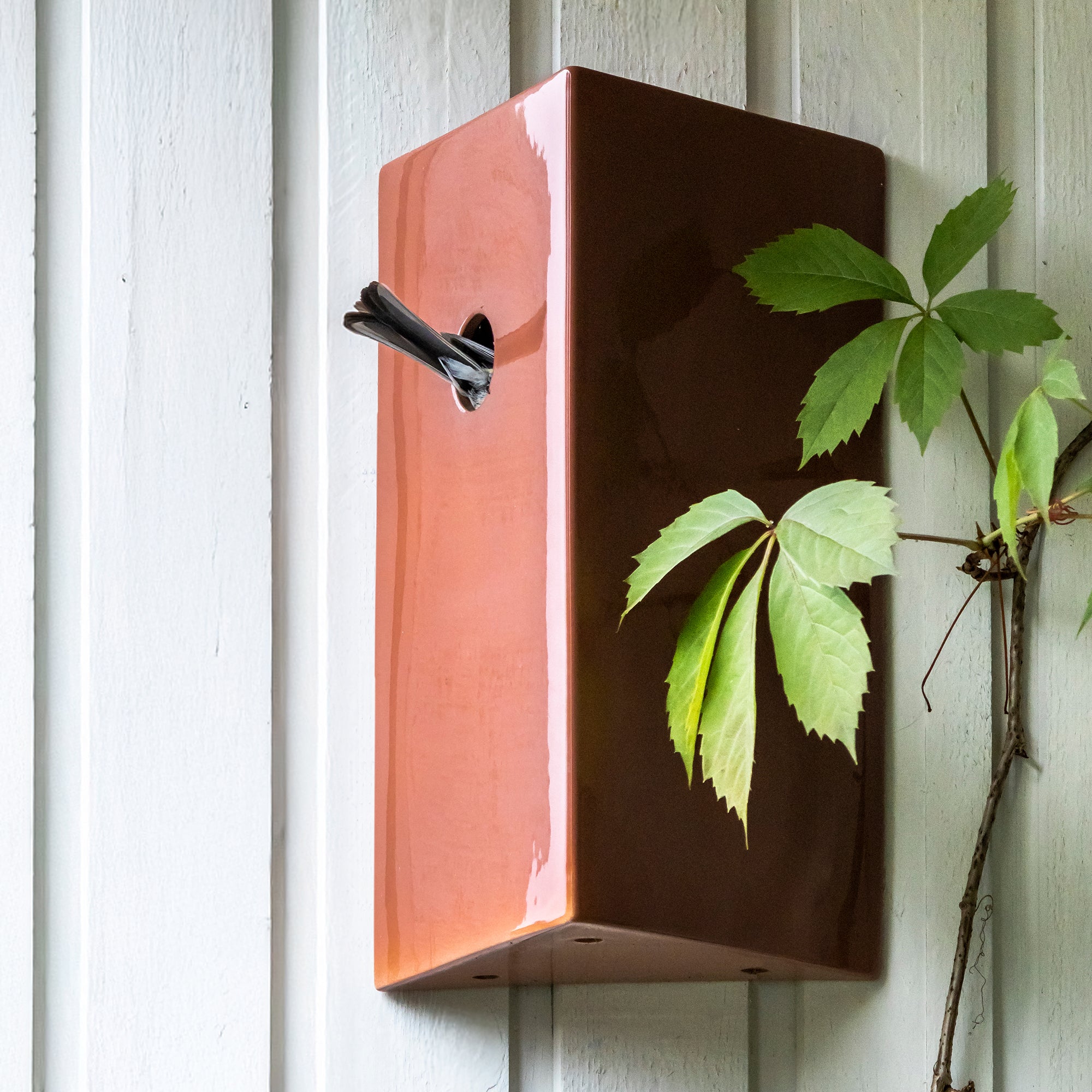 Hand-crafted in Portugal by a small ceramics workshop founded in 1979, KOTI mounts easily to the wall on a wooden cleat and lifts off for simple seasonal cleaning. A subtly textured interior helps chicks climb out safely, while the 1¼-inch entry hole welcomes a variety of songbirds, from chickadees to nuthatches.